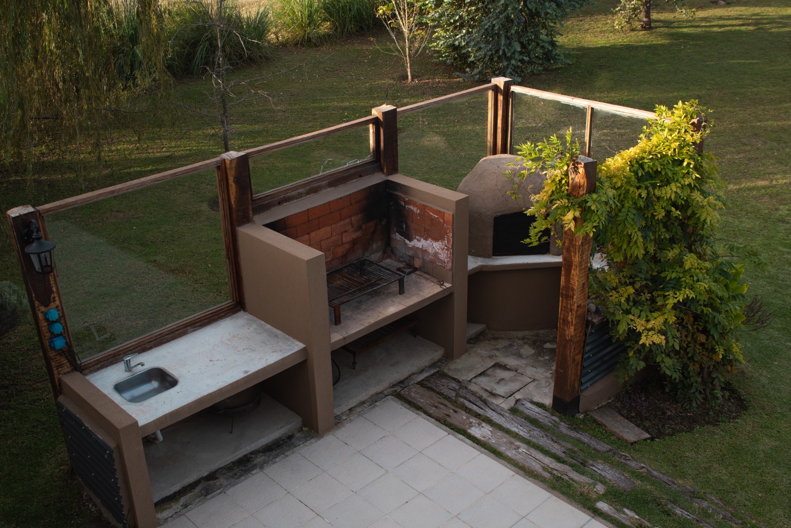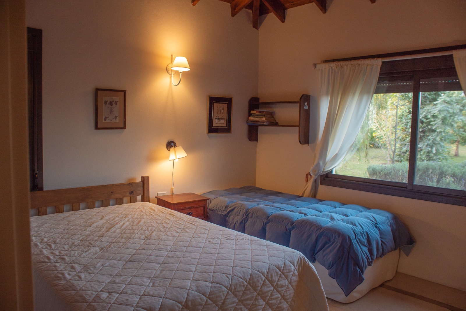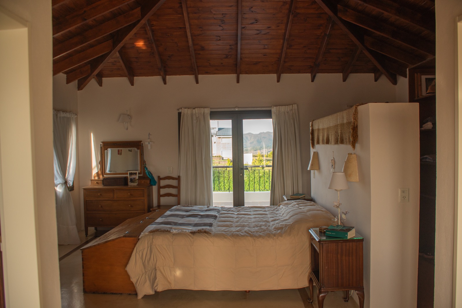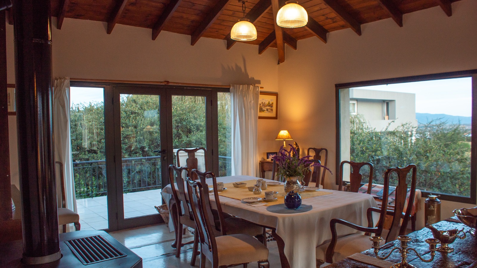 Cuenta con living–comedor con salida a galería, estufa Tromen, cocina–comedor amplia con cocina económica y lavadero. Dispone de cinco dormitorios (principal en suite con balcones), cuatro baños, y cochera para cuatro vehículos. En el exterior, parrilla y horno de barro.
